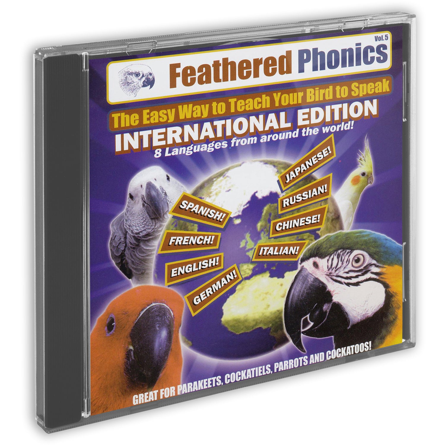 Feathered Phonics CD 5 takes your bird on a world tour of language learning! This international favorite teaches your parrot or bird to speak in eight different languages, including English, Spanish, French, German, Chinese, Japanese, Italian, and Russian. Each track features clear, easy-to-understand pronunciation of common words and phrases designed specifically for parrots and talking birds.